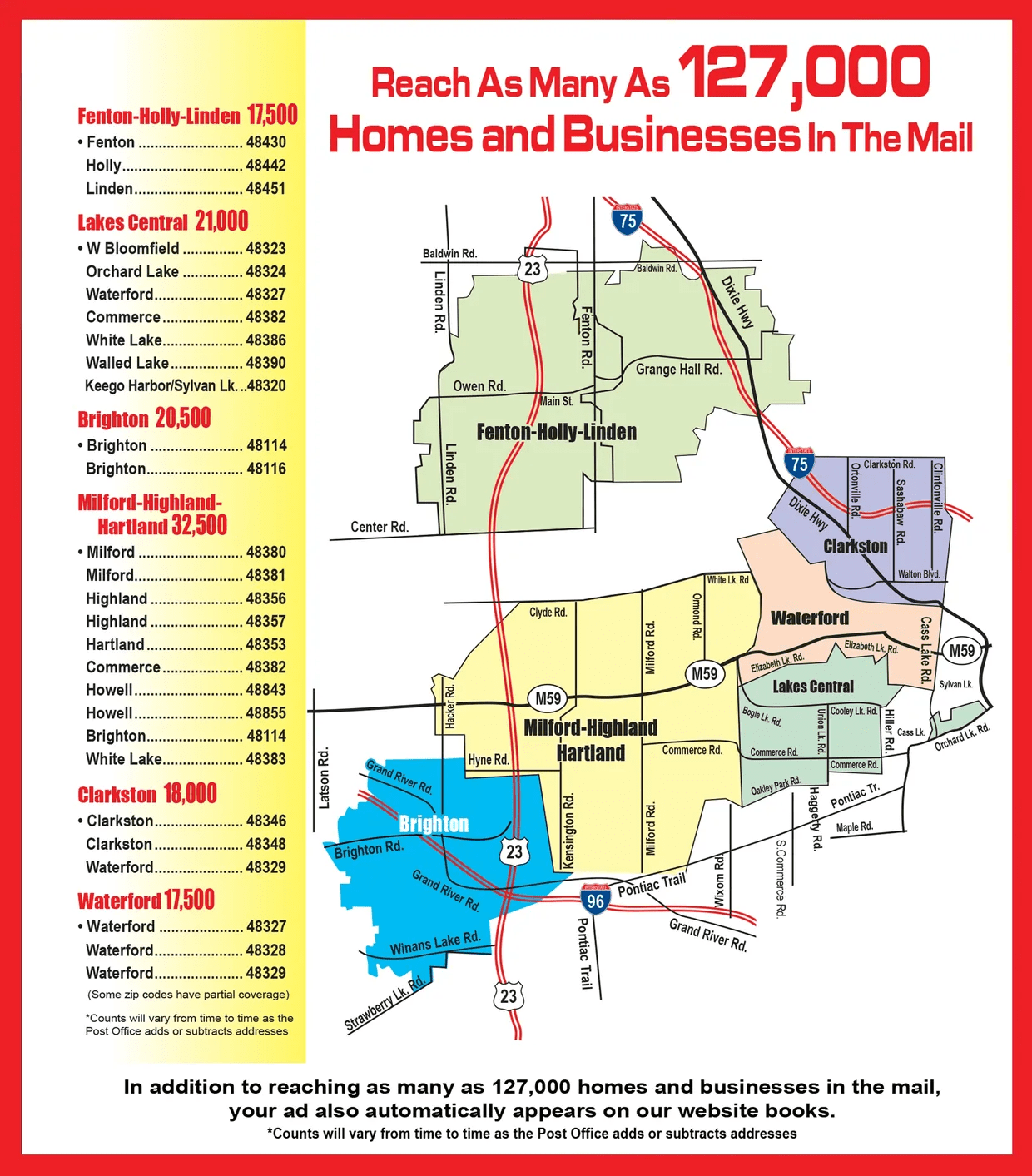 Reach your target market. Our six targeted mailing areas give you the flexibility to reach the areas you want to reach. Advertise in your neighborhood or throughout western Oakland, Genesee, and Livingston Counties. – It’s your choice.